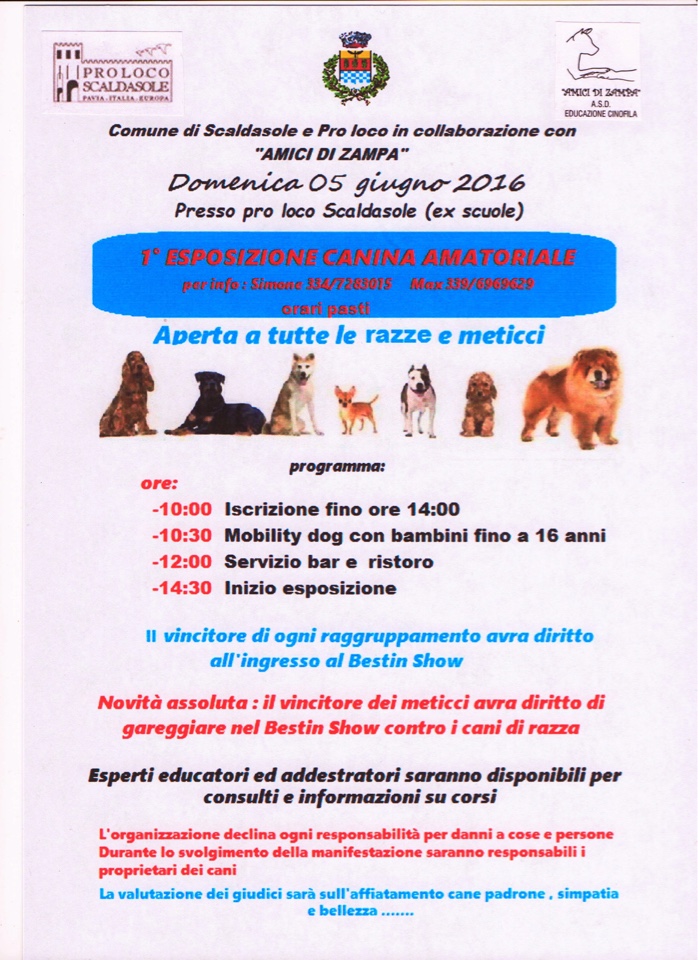 Il Comune di Scaldasole e la Pro Loco in collaborazione con "AMICI DI ZAMPA" presso la pro loco Scaldasole (ex scuole) organizzano la 1^ esposizione canina amatoriale aperta a tutte le razze e meticci.