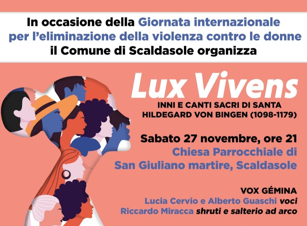 In occasione della giornata Internazionale per l'eliminazione della violenza contro le donne, il Comune di Scaldasole organizza Lux Vivens, inni e canti sacri di Santa Hildegard Von Bingen, sabato 27 novembre, ore 21:00, presso la chiesa parrocchiale di San Giuliano martire.