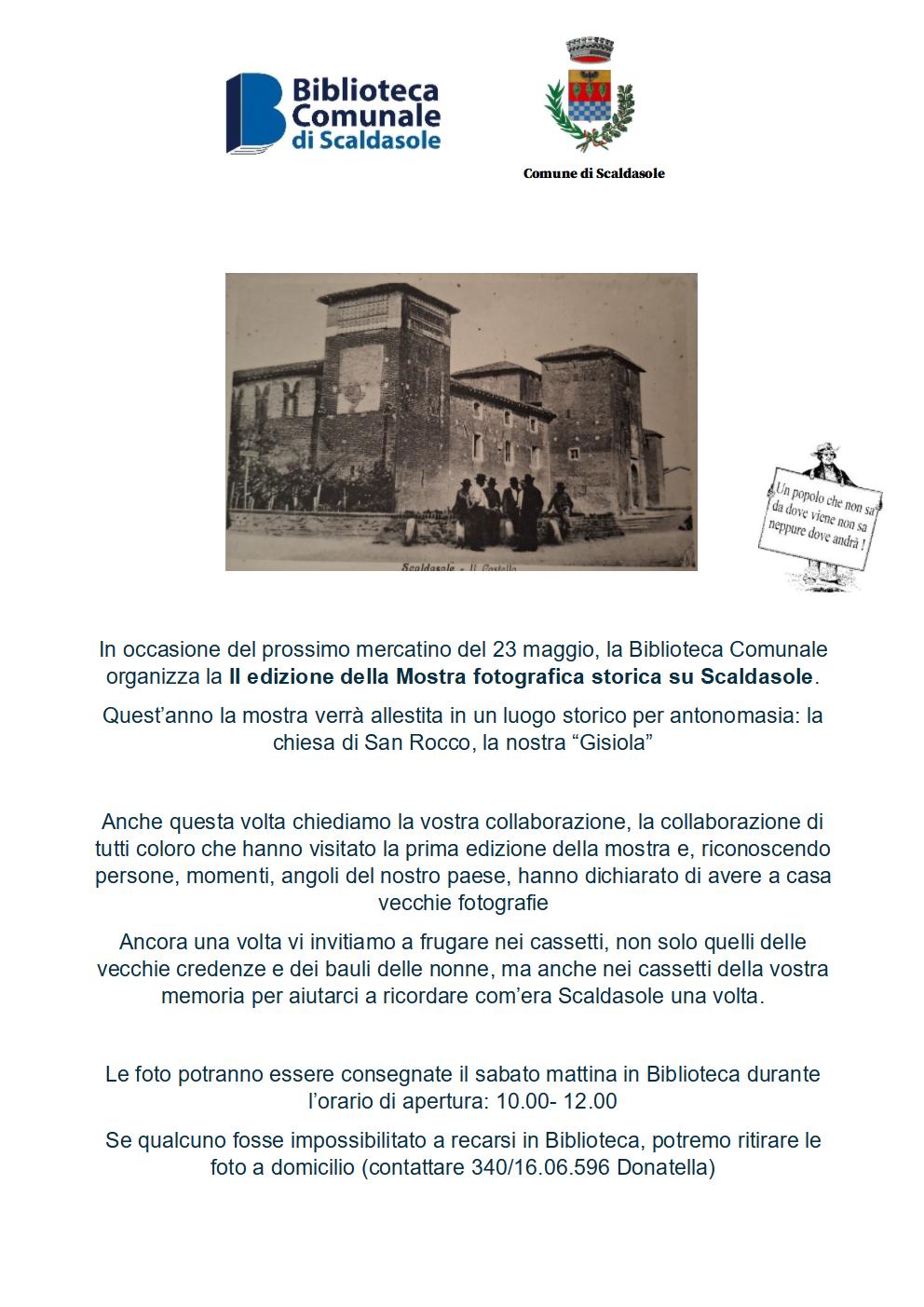 In occasione del prossimo mercatino del 23 maggio, la Biblioteca comunale organizza la 2^ edizione della mostra fotografica storica su Scaldasole.
