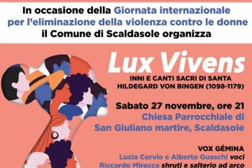 In occasione della giornata Internazionale per l'eliminazione della violenza contro le donne, il Comune di Scaldasole organizza Lux Vivens, inni e canti sacri di Santa Hildegard Von Bingen, sabato...