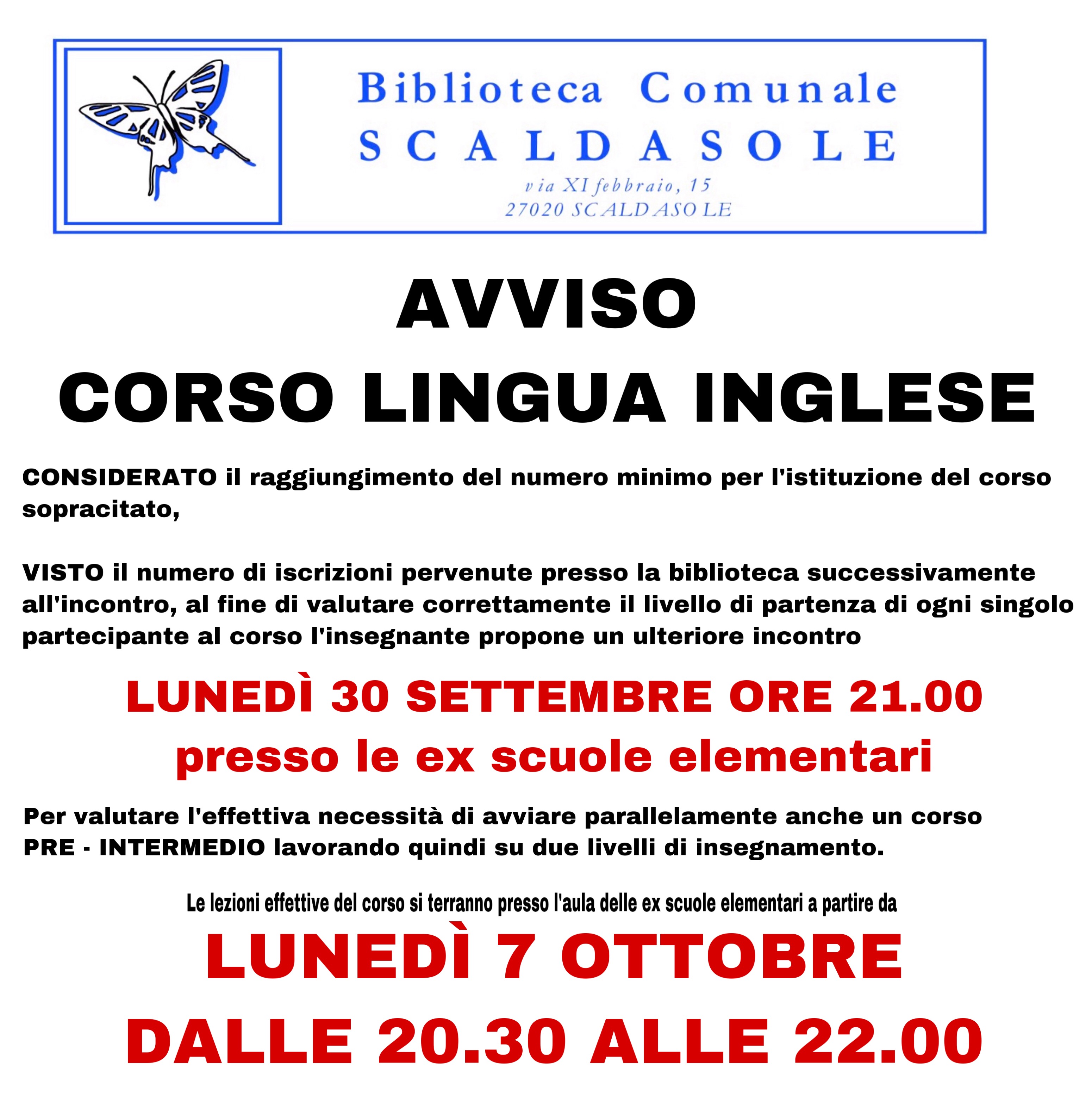 Considerato il raggiungimento del numero minimo per l'istituzione del corso d'inglese al fine di valutare correttamente il livello di partenza di ogni singolo partecipante l'insegnante propone un ulteriore incontro LUNEDI 30 SETTEMBRE ORE 21-presso le ex scuole elementari per valutare l'effettiva necessità di avviare parallelamente anche un corso pre-intermedio.Le lezioni del corso si terranno presso l'aula delle ex scuole elementari a partire da LUNEDì 7 OTTOBRE DALLE 20.30 ALLE 22