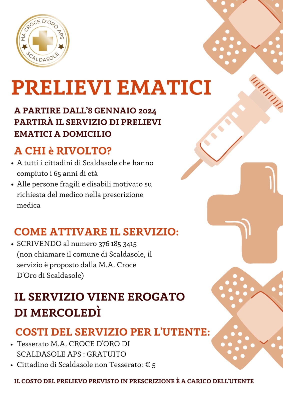 Costi del servizio per l'utente: tesserato M.A. Croce d'Oro APS Scaldasole: gratuito; Cittadino di Scaldasole non tesserato: 5,00 €.