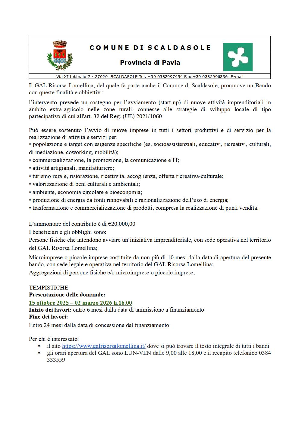Il GAL Risorsa Lomellina comunica l’apertura del bando relativo all’intervento “SRE04 – Start Up non agricole”.