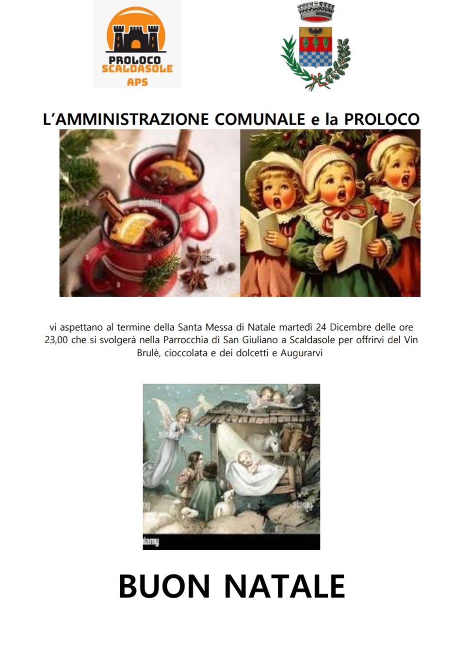 L'Amministrazione Comunale e la Pro Loco vi aspettano al termine della Santa Messa di Natale, martedì 24 dicembre dalle 23:00, per offrirvi vin brulé, cioccolata e dolcetti.