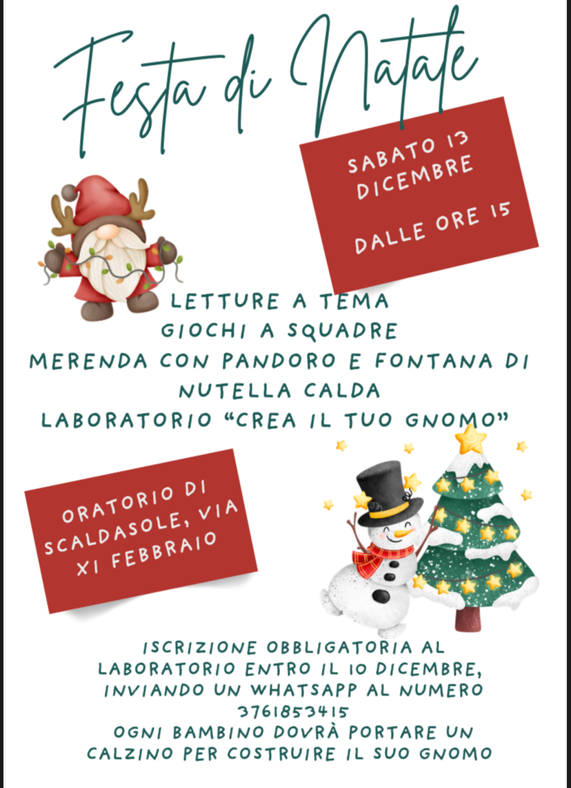 Letture a tema, giochi a squadre, merenda con pandoro e fontana di nutella calda, laboratorio "crea il tuo gnomo".