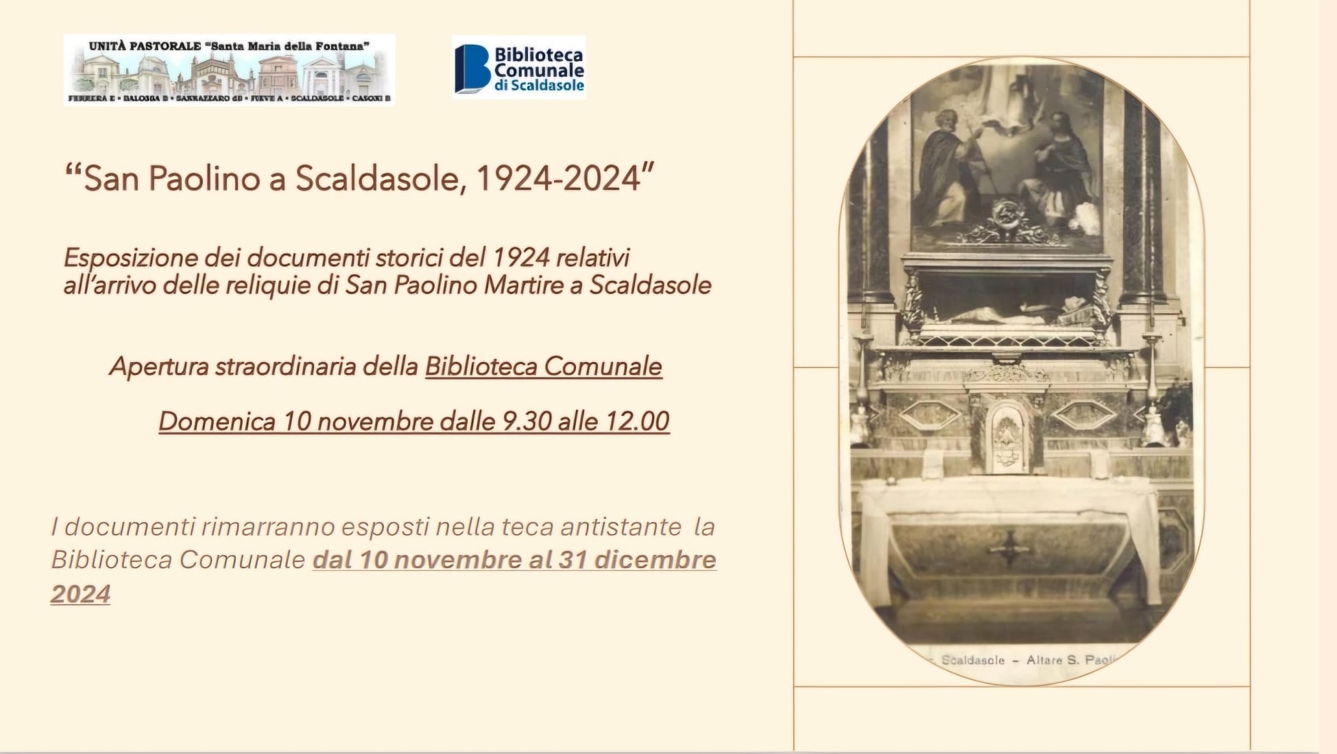 Esposizione dei documenti storici del 1924 relativi all'arrivo delle reliquie di San Paolino Martire a Scaldasole.